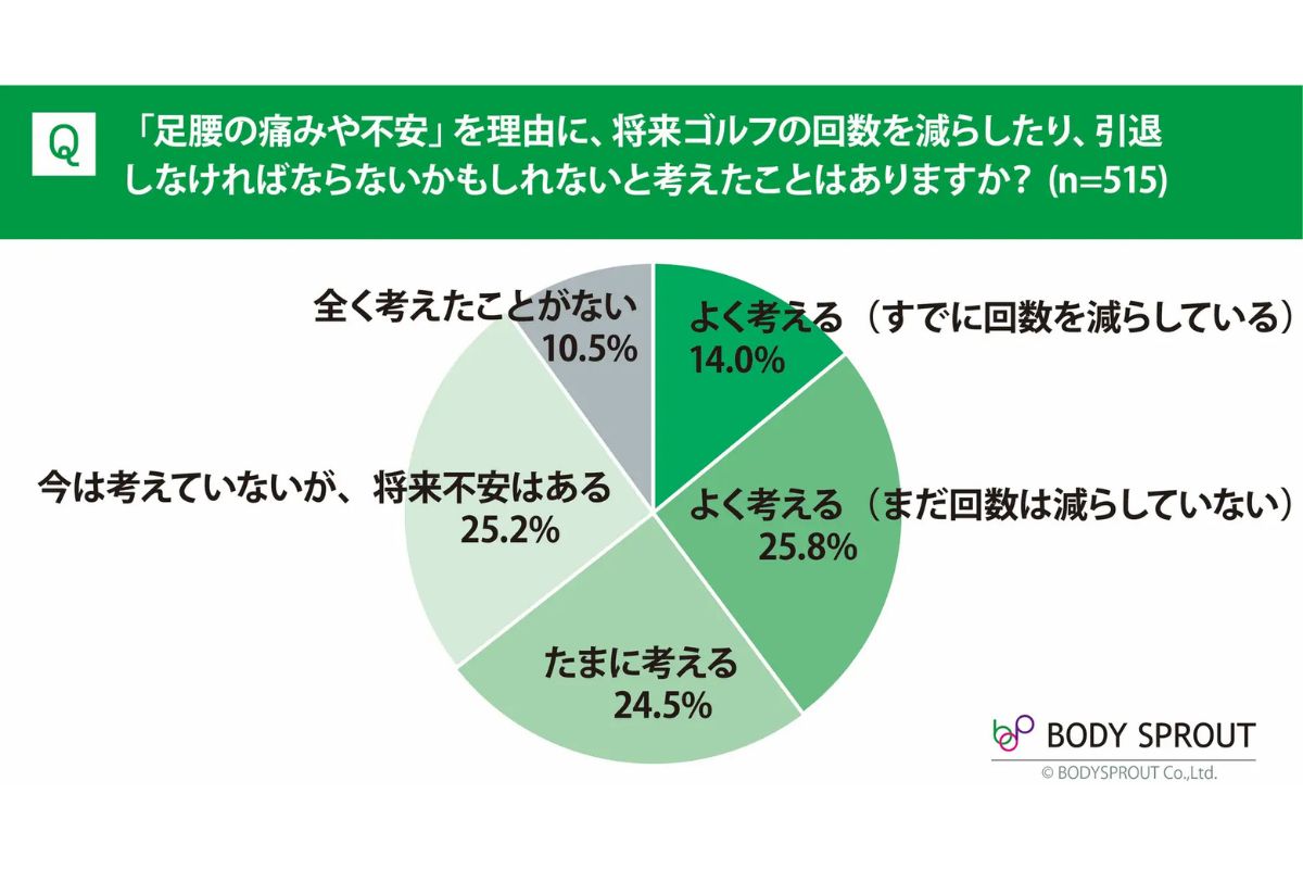 対策が見つからないままだと、どうなるのか。「足腰の不安を理由に、ゴルフの回数を減らしたり引退を考えたことがあるか」を聞いたところ、「すでに減らしている」(14.0%)と「よく考える」(25.8%)を合わせると、約40%。