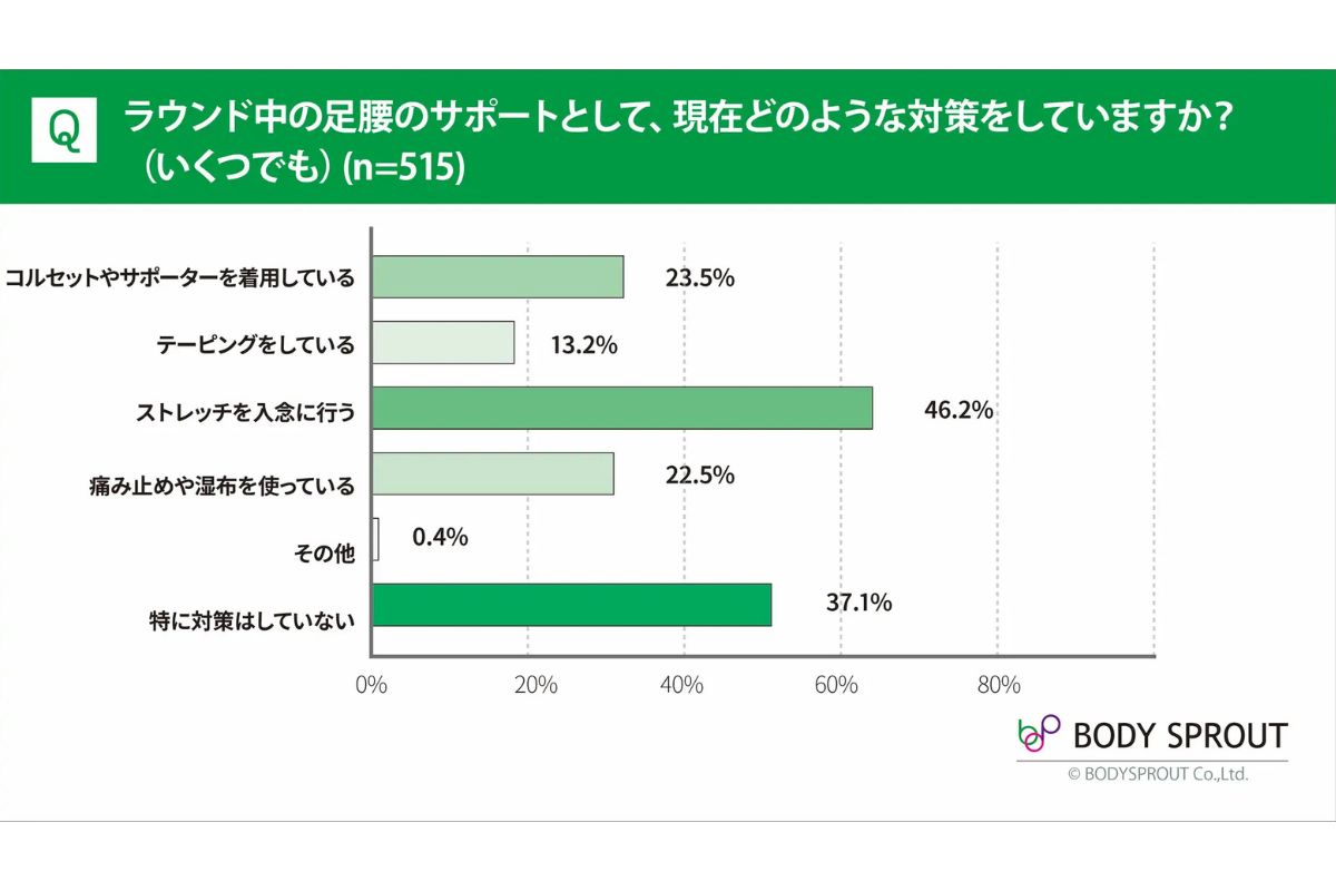 調査では、最も多い対策はストレッチ(46.2%)でした。しかし毎回のラウンド前に入念に行い、それを何年も続けるのは、現実的にはかなり難しいものです。