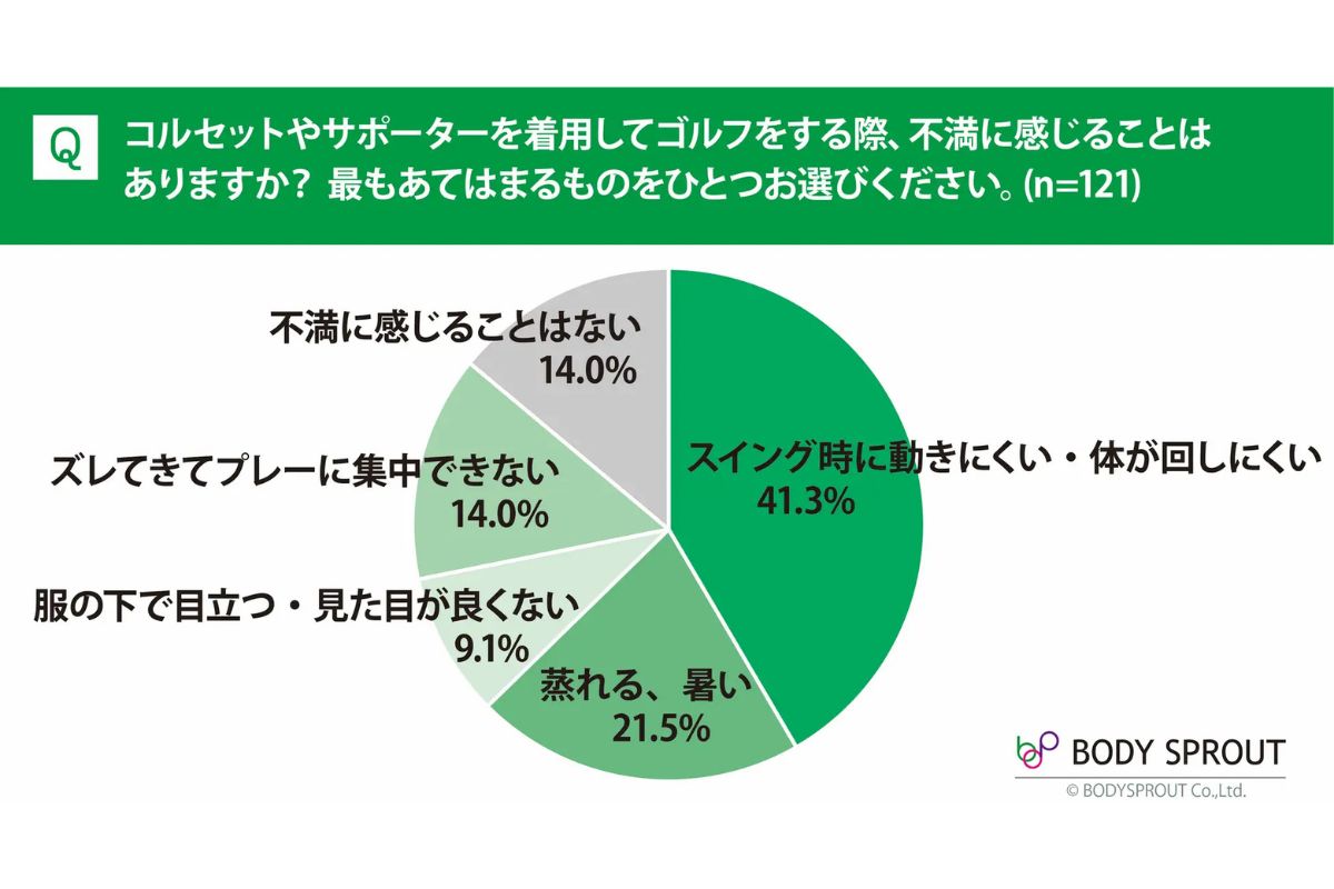 サポーターを使っている人は23.5%。ただ、使用者に不満を聞くと、「スイング時に動きにくい」が41.3%。身体をサポートするはずの道具が、スイングそのものを妨げている。