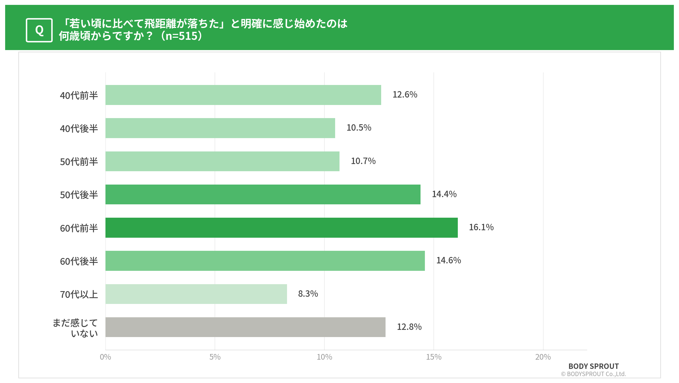 では、この問題はいつから始まるのでしょうか。515名に「飛距離の低下を感じ始めた年齢」を聞いてみると、興味深い結果が出ました。